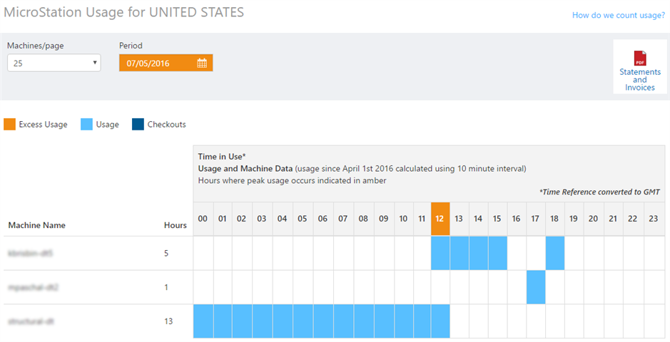 Product usage is graphically plotted by individual machines over 24 hours. The hour in which any excess usage was accrued is highlighted in orange.
