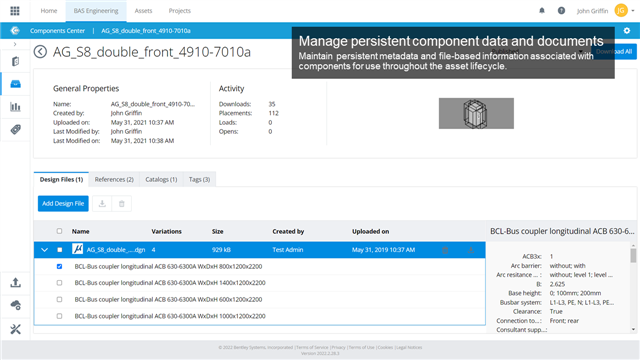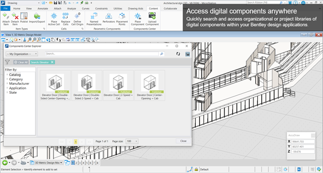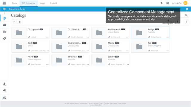 ProjectWise Components Center is a cloud-based digital component library and catalog management service. It allows a connected organization to manage and distribute digital components across projects, disciplines, and supply chains.