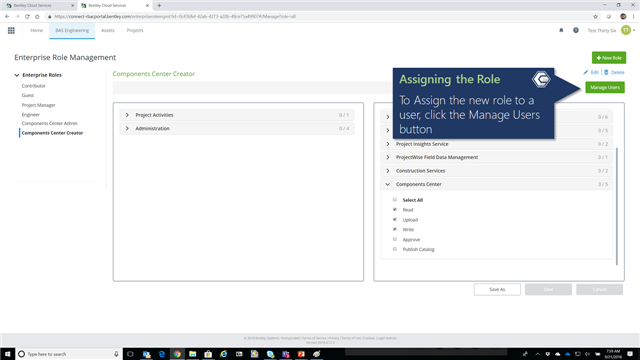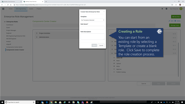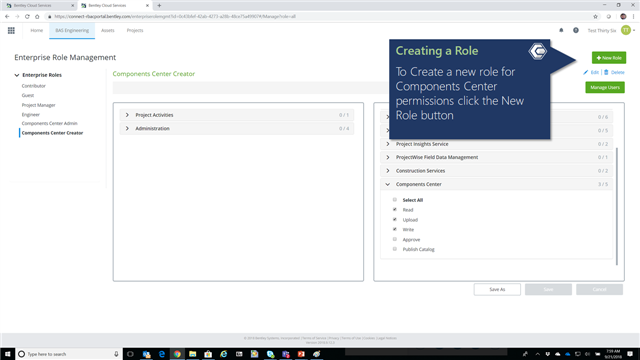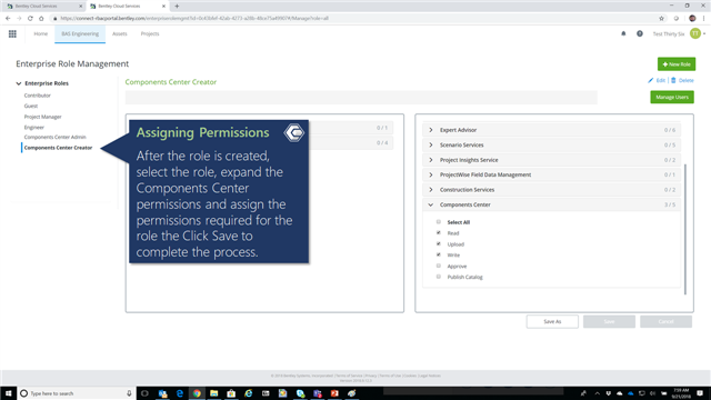 After the role is created, select the role, expand the Components Center permissions and assign the permissions required for the role the Click Save to complete the process.