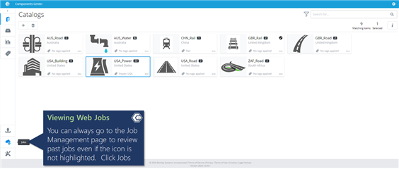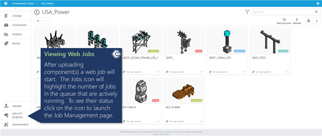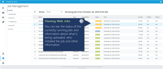 After uploading component(s) a web job will start. The Jobs icon will highlight the number of jobs in the queue that are actively running. To see their status click on the icon to launch the Job Management page.