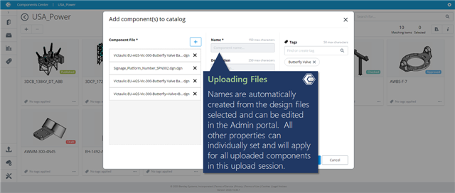 Names are automatically created from the design files selected and can be edited in the Admin portal. All other properties can individually set and will apply for all uploaded components in this upload session.
