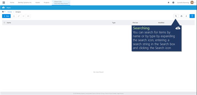 You can search for items by name or by type by expanding the search icon, entering a search string in the Search box and clicking the Search icon.