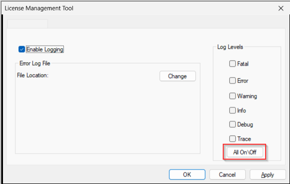 5) Click the All On\Off button in the Log Levels section to capture all diagnostic data.