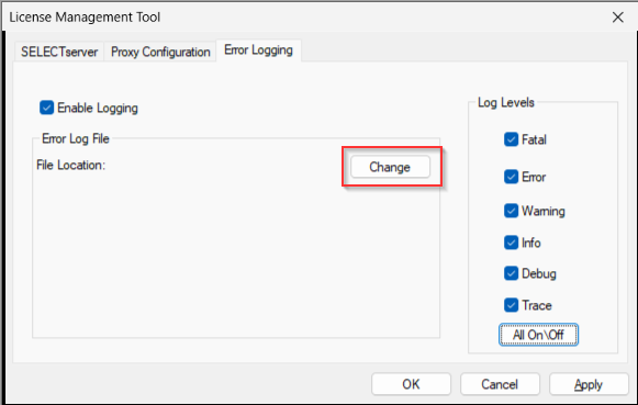 6) Click the Change button in the Error Log File section and specify a location to save the log file.