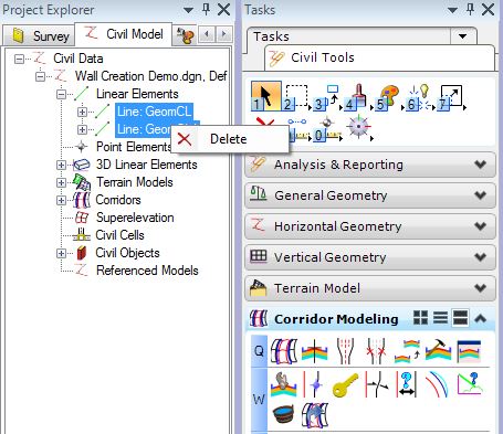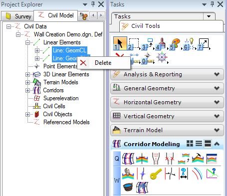 3. Use the Project Explorer > Civil Model > Linear Elements to select one or more elements, right-click on the selection in the Project Explorer and 'Delete'.
