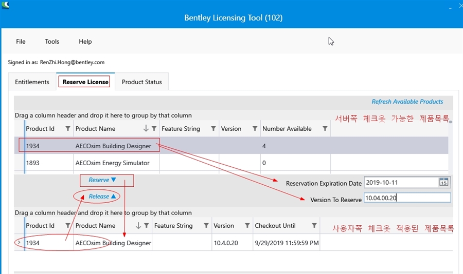 아래 사진과 같이 사용자가 온라인 상태에서 Bentley Licensing Tool 을 실행하고, Reserve License 탭 웟부분에 표시된 제품 목록 중에서 원하는 프로그램을 선택한다. 만료 날짜 와 버전정보를 입력한 후, 가운데 Reserve 버튼을 클릭하면 해당 제품의 라이선스를 체크아웃할 수 있다. 반대로 라이선스를 서버에 반환할 경우, 해당 제품을 선택한 후 가운데 Release 버튼을 클릭하면 된다.