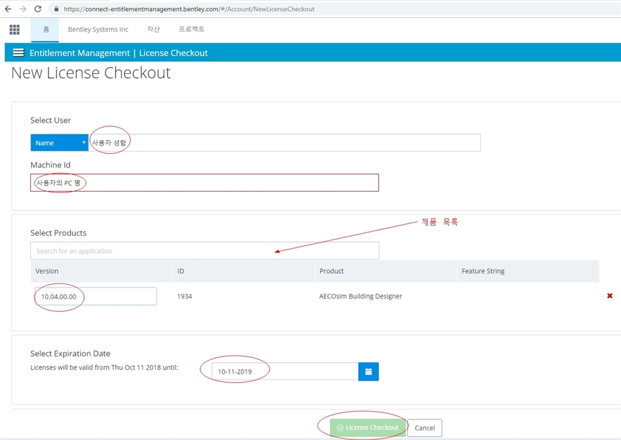 그다음, 페이지 우측에 초록색으로 표시된 New Checkout 버튼을 누르면, 아래 사진과 같이 체크아웃 화면이 보인다. 사진에 표기 및 설명에 맞춰 필요한 정보를 정확히 입력한 후, 아래에 License Checkout 버튼을 누른다. (사용자 성함 부분은 무족건 기존 user list 에서 선택해야 한다, 만약 임의로 입력하면 적용 안된다. )