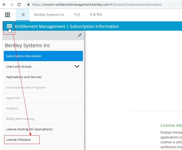 그다음, 아래 사진과 같이 좌측 상단에 아이콘을 클릭하면 메뉴가 나타나며 그중에서 License Checkout 을 클릭한다.