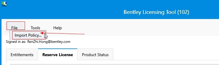 사용자는 아래 사진과 같이 Bentley Licensing Tool 을 통해 받은 파일을 Import 하면 체크아웃 라이선스를 적용할 수 있다.