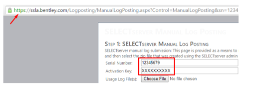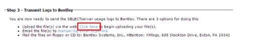 La página de transmision de registros de uso del Site de administración de SELECTserver proporciona un enlace en el paso 3 a un sitio web para publicar manualmente los registros de uso.