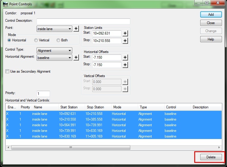 Essentially, the Curve Widening command simply facilitates the creation of horizontal point controls that are applied to backbone points. The end result of the Curve Widening tool is a series of point controls used to widen lanes and/or edge of pavement lines around curves. To remove curve widening, simply delete the point controls by going to Corridor > Point Controls.