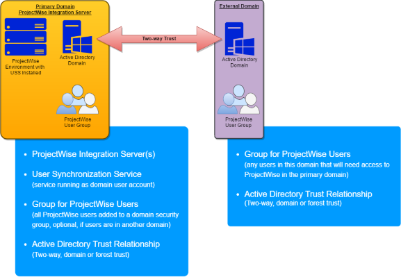 In scenarios where the ProjectWise Integration Server and other back end services are in one domain, and user accounts that need to use ProjectWise belong to another, a trust relationship between the two domains must be in place. This trust should be configured as ‘two-way’, meaning that users from one domain can log into resources belonging to the other domain, and vice versa. This guide assumes that a trust relationship between your primary and external domains is already in place. Additional information regarding Active Directory Domains and Trusts are available on Microsoft TechNet.