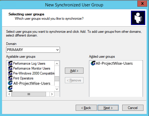 5) In the pull-down, select your Primary domain, then locate the group you created for users in the primary domain in the list. Click the ‘Add >>’ button to add to the list. Click ‘Next’, then ‘Finish’.