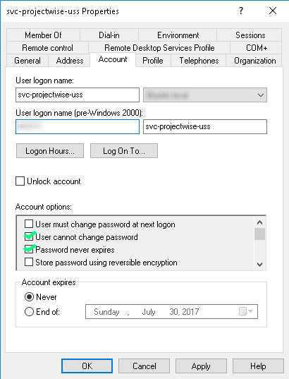 1) Identify a domain account for use as your service account. Ensure that this account has a secure password, and set the ‘Password never expires’ flag, if permitted by your organization’s security policy.