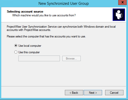 4) If the User Synchronization Service is running on the local computer, select ‘Use Local Computer’, otherwise, type the name of the computer that is hosting the service. (Typically the Integration Server). Click ‘Next’.