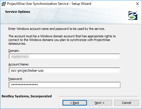 5) During installation of the service, you will be prompted to provide a ProjectWise logical user account. This account should be configured as a delegate user. It will be used to access the datasource and add the users to the ProjectWise database, so permissions for this account should be set appropriately.