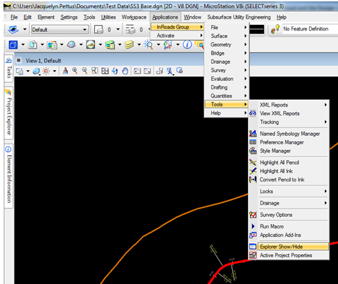 To hide the InRoads Explorer window, users should select (in the MicroStation menu) Applications > InRoads Group > Tools > Explorer Show/Hide.