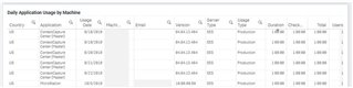 A list of the machines that have used Bentley applications and how long they were used on each day.