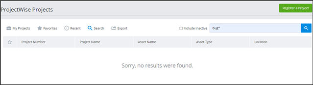 Bei der Suche nach einem ProjectWise-Projekt nach Name oder Nummer erhalten Sie "Sorry, keine Ergebnisse gefunden" ("Sorry, no results found").