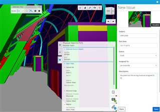 identify and report problems found during your model review using our issue service. Capture issues associated with items and share these issues with other project participants. Each issue has a set of editable fields, defined by the project administrator from the Issue Resolution Service tile in the Project Portal. To capture an issue click on the "Create issue" tool in the tool bar then select an element in the view. The new issue form will display in the right panel for you to fill out. Once complete just save the issue and it will be stored in our Issue Resolution service with other issues associated to the project.