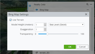 Get more from your background maps by enabling terrain mode which will show the 3d topography of the map to display your models in the context of its surrounding environment. To enable the 3d map just go to the reality data panel and select the more actions button ••• and choose settings. From the settings dialog you can enable the terrain option and then adjust the elevation of the map. Because some of your data maybe underground you can use the transparency to be able to see through the map.