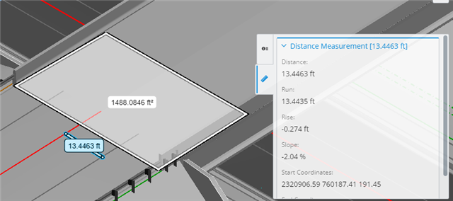The Station Offset tool allows the user to take an offset measurement from linear geometry in the model. After selecting the desired linear geometry the user can move the cursor to the location of the desired measurement.