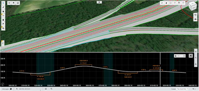 The profile tool allows the user to open a second viewport to view the Profile information included on any linear geometry within the model. The information available in the profile tool will be more detailed when loading a Civil design file from Open Roads Designer.