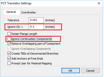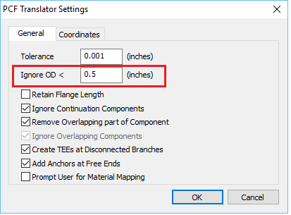 On PCF Translator Settings dialog the default value is 0.5 inches. Meaning that any pipe OD less that 0.5 inches are not imported.