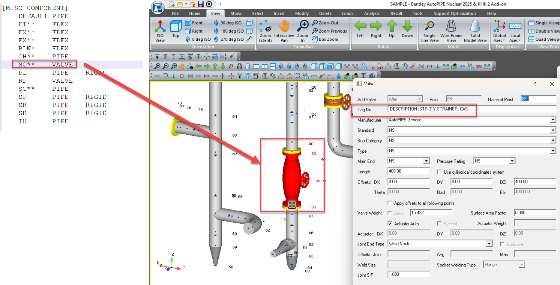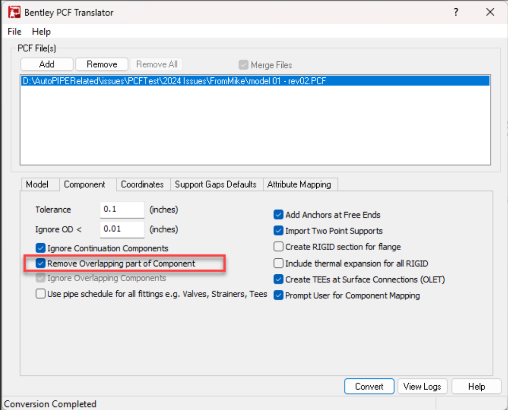 As a result of these PCF setting changes the model is brought in with all components and pipe size available in the PCF file.