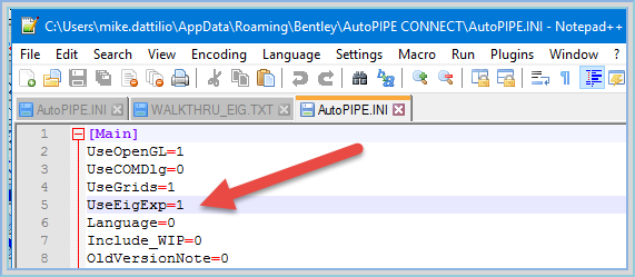 In addition there is an EigDump feature that is undocumented. To enable this feature, users must modify the "UseEigExp=0" setting from "0" to "1" in the Autopipe.ini file, indicated below: