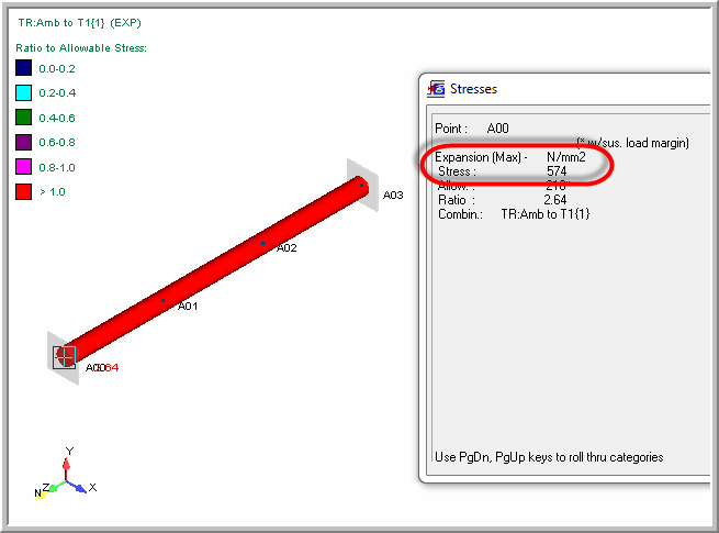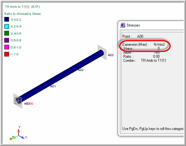 In my simple model with an Rigid Anchor - Pipe - Rigid Anchor, with when a thermal load case is applied should expect high Code Stresses for Max Range at the anchors, however it appears that AutoPIPE's is not calculating the results correctly, why?