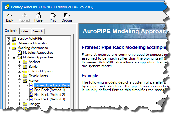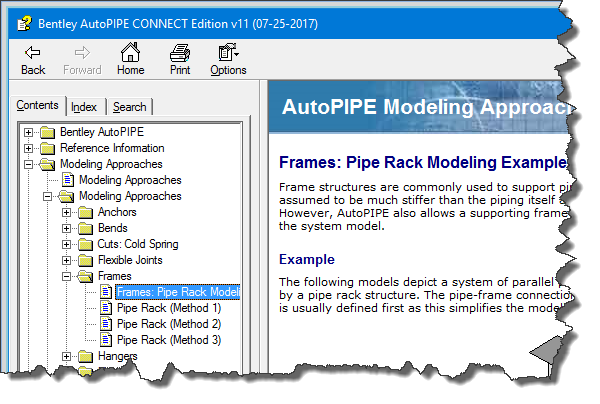 Help > Contents> Contents Tab> Modeling Approaches> Modeling Approaches> Frames> Frames: Pipe Rack Modeling Examples