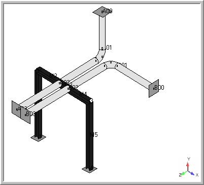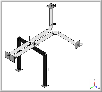 The following models depict a system of parallel pipe runs (shown in the figure) which are supported by a pipe rack structure. The pipe-frame connection type varies with each model. The piping system is usually defined first as this simplifies the modeling of the frame that supports the pipes.