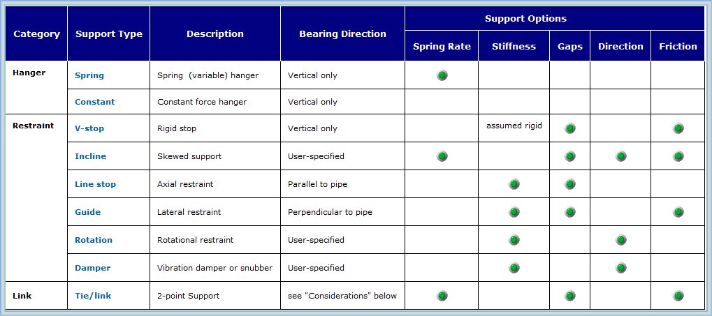 First ask yourself what type of AutoPIPE support(s) are required to mimic the actual support. AutoPIPE allows the user to place one or more supports at a node point to mimic an actual support. How is the pipe restrained / allowed to move in this image above?