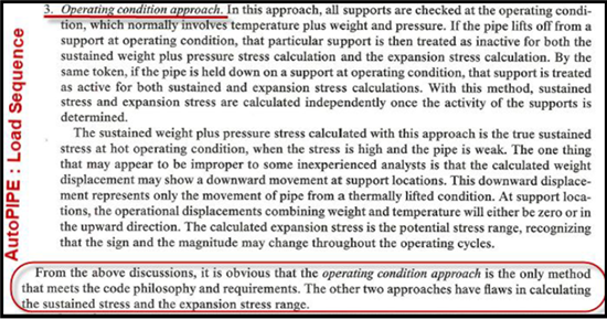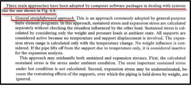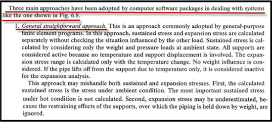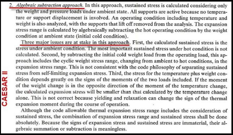 In 2009, ASME published that there are generally 3 methods used by most computer programs for stress analysis, 2 of which "General Straight forward Approach" and "Algebraic Subtraction Approach" (used by Caesar II) were found to produce inaccurate results. Only "Operating Condition Approach" used by programs like AutoPIPE, FE Pipe, Ansys, Abacus, Simplex II. that meets the code philosophy and requirements.Item #3: Review of 3 General methods used by Stress Analysis computer programs