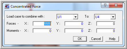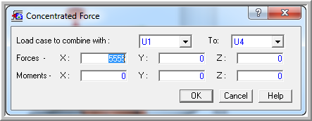 Example, the following concentrated force is applied to load cases U1-U4, and will only be applied when U1, U2, U3, or U4 is included in a combination.