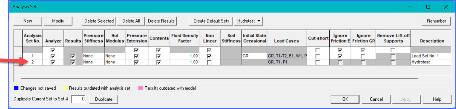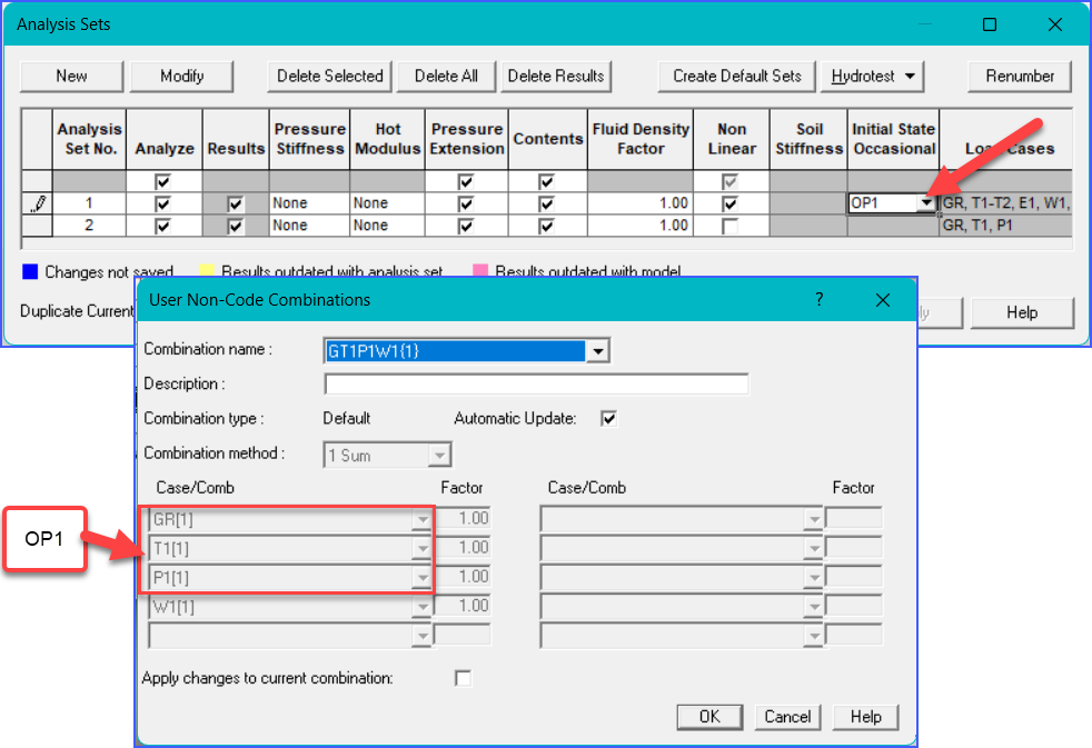 Analysis set options “Ignore Friction E” and “Ignore Friction GR” have to be removed because by caesar the friction is always acting First the analysis has to be done for the code stresses and once it is done, you can create your own non-code combinations. It is used to create your operating case or compare some loading case to define the maximum forces and moments on nozzles from the equipment. By AUTOPIPE , The code combinations are done automatically and users can define as many analysis set as we want and combine the results as needed. For instance, the hydrotest is a linear analysis so that we can define a 2nd analysis set to define this case.