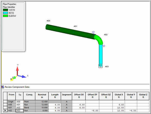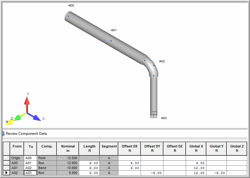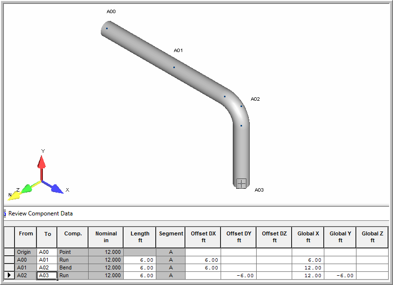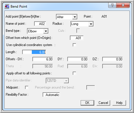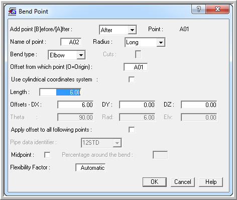7. Finish the bend by defining a run of pipe to A03. Insert Run, Dx = 0, Dy = -6 feet, Dz = 0. press OK button.