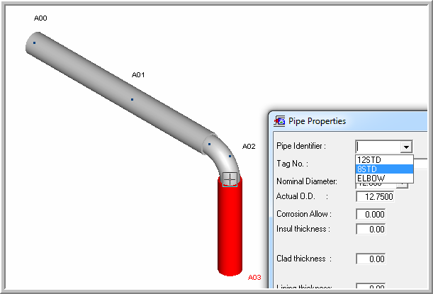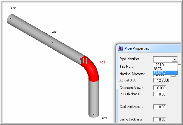 10. Select the elbow only and apply the Elbow pipe property with Modify> Pipe Properties Over Range... command, specify "Elbow" Pipe identifier: