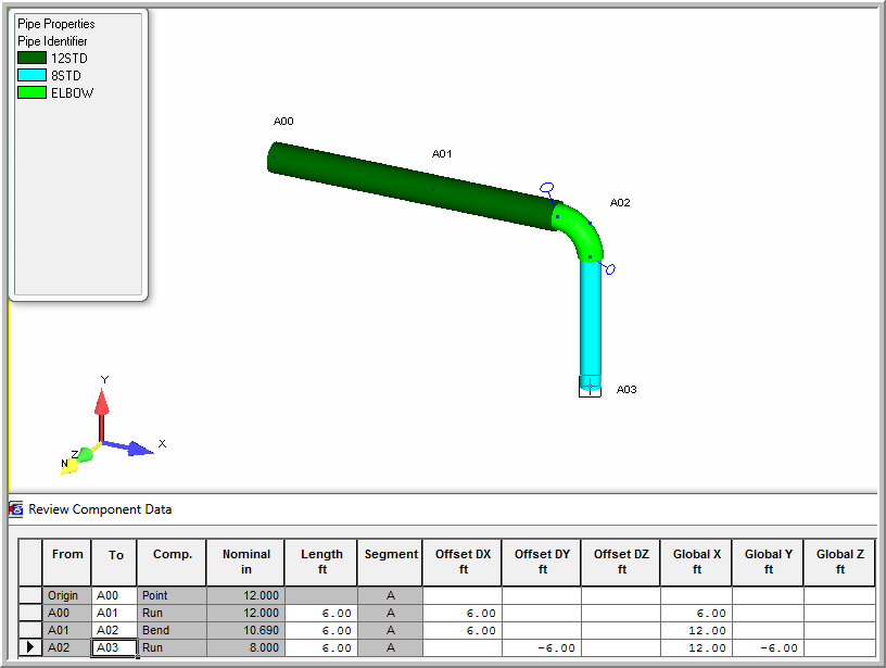 In this model a 12 inch pipe is connected to an 8 inch pipe by a reducing elbow. The bend is modeled with a pipe section that is an average of the connecting pipes. Next, stress intensification factors (SIF's) are defined at each end in order to represent the SIF's for an actual reducing elbow. Since the piping codes do not specify SIF's for reducing elbows, this information must be provided by the user. Contact the elbow manufacturer for information on their recommendation for SIF values.