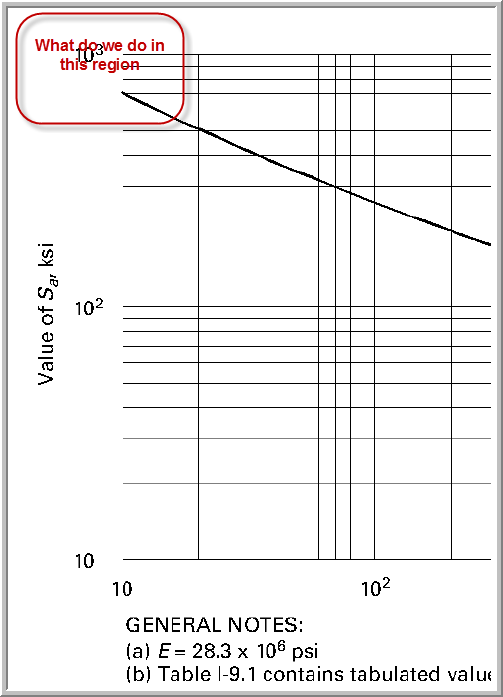 Since the fatigue data is tabulated such that at the highest tabulated stress, 10 cycles are allowed, what AutoPIPE will do if the upper tabulated stress is exceeded. So what does AutoPIPE do at the low cycle end of the curve?