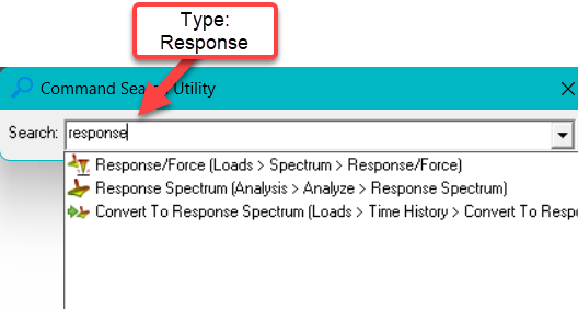With an AutoPIPE model opened, search for command to launch the Response/ Force Spectrum dialog, use mouse to select the first option in the listing: