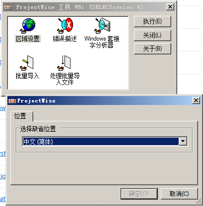 3.安装ProjectWise Language Pack - Chinese (Simplified) (x64).msi 或者ProjectWise Language Pack - Chinese (Simplified) (x86).msi,并选择Projectwise的显示语言是中文的,以保证发布向导是汉化过的,如下: