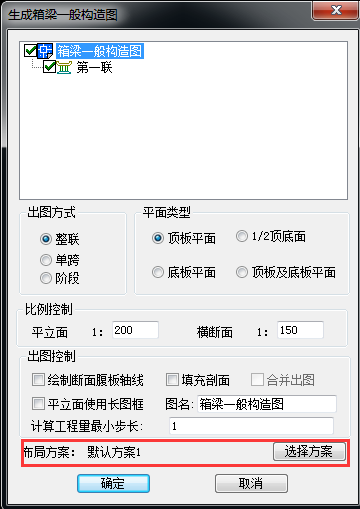 第一:点击出箱梁详图的工具,弹出对话框。在对话框的靠下的位置有“布局方案”。