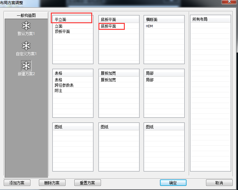 点击”平立面“,弹出对话框可以修改布局的名称。可以把“底板平面”拖到任意一个布局框中。