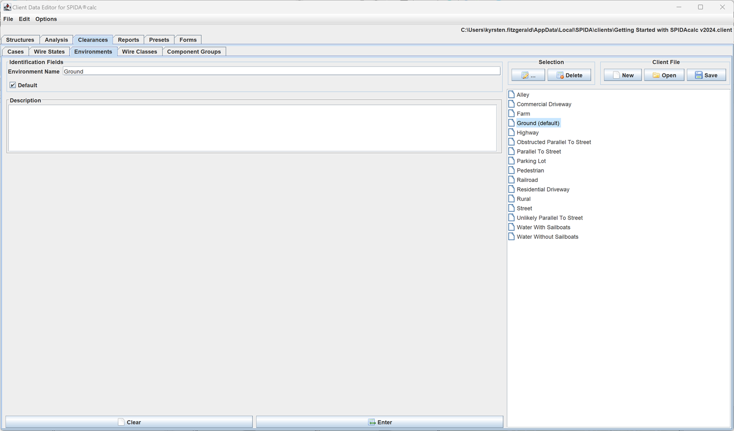 Select the Enter button to define the new environment listing or the Clear button to reset all identification fields. Once the Enter button is selected, the new environment listing is displayed in the adjacent selection tree on the right side of the screen. (Note: The Environment sub-tabs under Clearances and Presets are duplicative; changes made in one tab will update the other.)