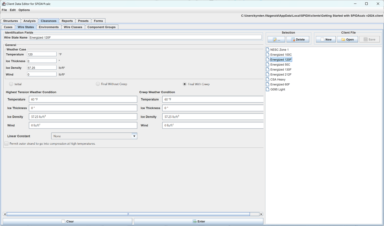 Select the Enter button to define the new wire state listing or the Clear button to reset all identification and weather fields. Once the Enter button is selected, the new wire state listing is displayed in the adjacent selection tree on the right side of the screen.