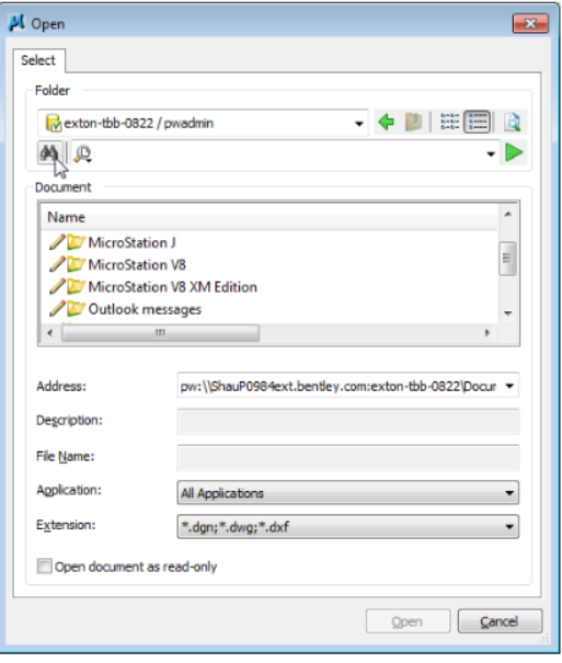 在已经集成的文件选择对话框里,你可以选择Projectwise搜索方式:快速搜索或者高级搜索,来搜索您需要的文档。