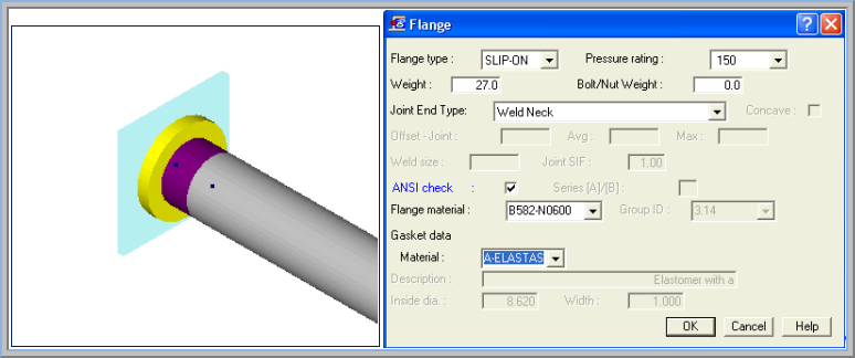 In AutoPIPE, Flanges are a 1 point element with no length i.e. considers only the flange weight and type of weld connection to pipe for SIF calculation. Yes, assuming flange stiffness is same as the pipe is technically incorrect because a flange is more rigid than pipe, but no, it doesn't affect analysis results to any significant extent in most cases. Cases you may wish to model the rigid length of the flange would be in a short stiff piping arrangement or close to equipment like pumps. If you want to input flange length, insert a pipe run and insert flanges at the mating point then select this short length and use Insert > Rigid options over Range, change settings as needed and press OK to continue. AutoPIPE has an option to do ANSI flange loading check.