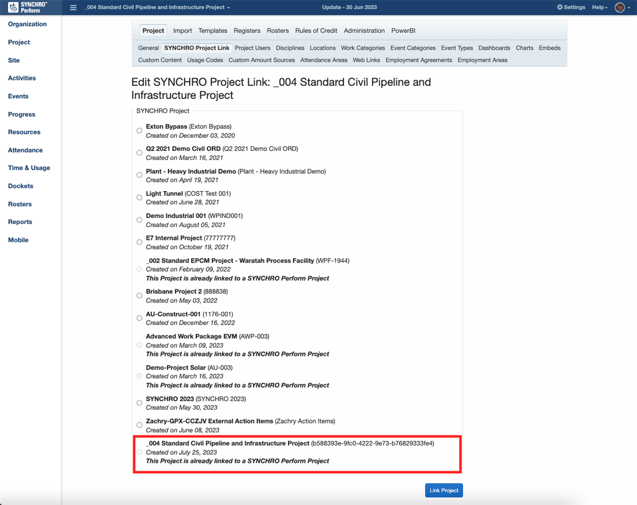 4) Ensure you are using IMS/Bentley SSO to link projects, making sure you select the project you want to link between Perform and Control.